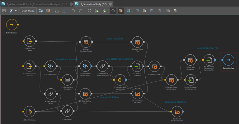 Figure 4: The Dymola Simulation and Check Steady State Results workflow as part of a control-oriented system analysis process. When parameterizing the workflow, only the input interface inputs are now displayed, which significantly simplifies the handling of extensive workflows