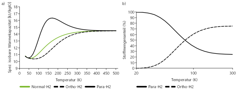 Figure 2 a) Temperature dependent specific isobaric heat capacity of para-, ortho- and normal hydrogen. b) Temperature dependent composition of equilibrium para- and ortho-hydrogen