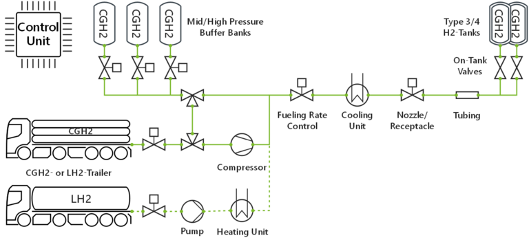 Based on this knowledge and the corresponding tools, we have, together with our customers and the Institute of Thermodynamics, described and analyzed various hydrogen filling station concepts using models. Figure 1 shows these concepts in simplified form. The different variants shown here - liquid (LH2) and gaseous (CGH2) hydrogen storage at the filling station, cascading buffer storage and direct compression as an operating strategy as well as variable vehicle-side compressed gas tank systems (Type III/Type IV) - have already been modeled by us.