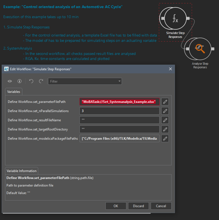 Figure 4: The Dymola Simulation and Check Steady State Results workflow as part of a control-oriented system analysis process. When parameterizing the workflow, only the input interface inputs are now displayed, which significantly simplifies the handling of extensive workflows